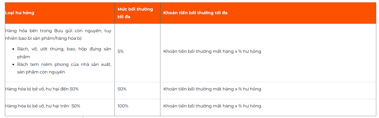 Trong mọi trường hợp mất, thất lạc hoặc hư hỏng xảy ra cho hàng hóa, khoản tiền bồi thường sẽ không thấp hơn 04 (bốn) lần Cước phí của Dịch vụ đã sử dụng.